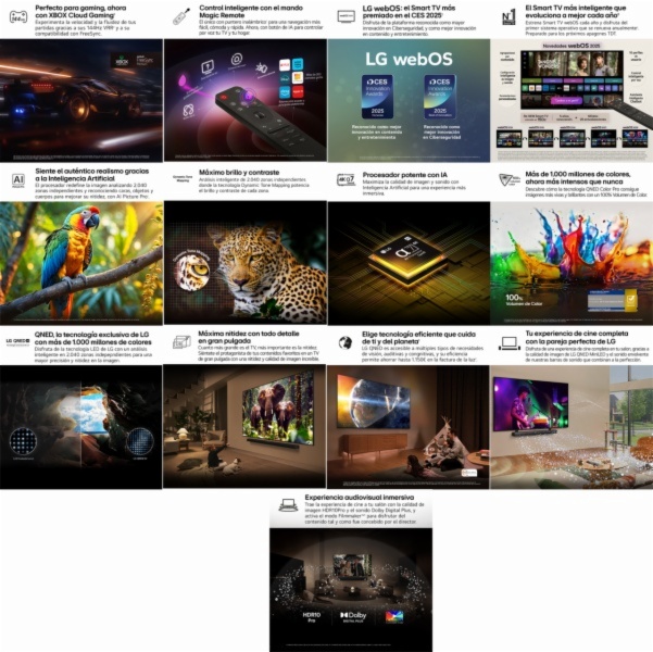 • Smart tv webos 25 que evoluciona a mejor cada año renovándose en tu tv e incorporando las nuevas funciones de la ia y que está preparado para próximos apagones tdt (2). más inteligente para una personalización y un control del hogar avanzados (3): reconocimiento de voz, recomendación de contenidos, configuración de imagen y sonido, asistente virtual y mando magic remote con puntero inalámbrico.